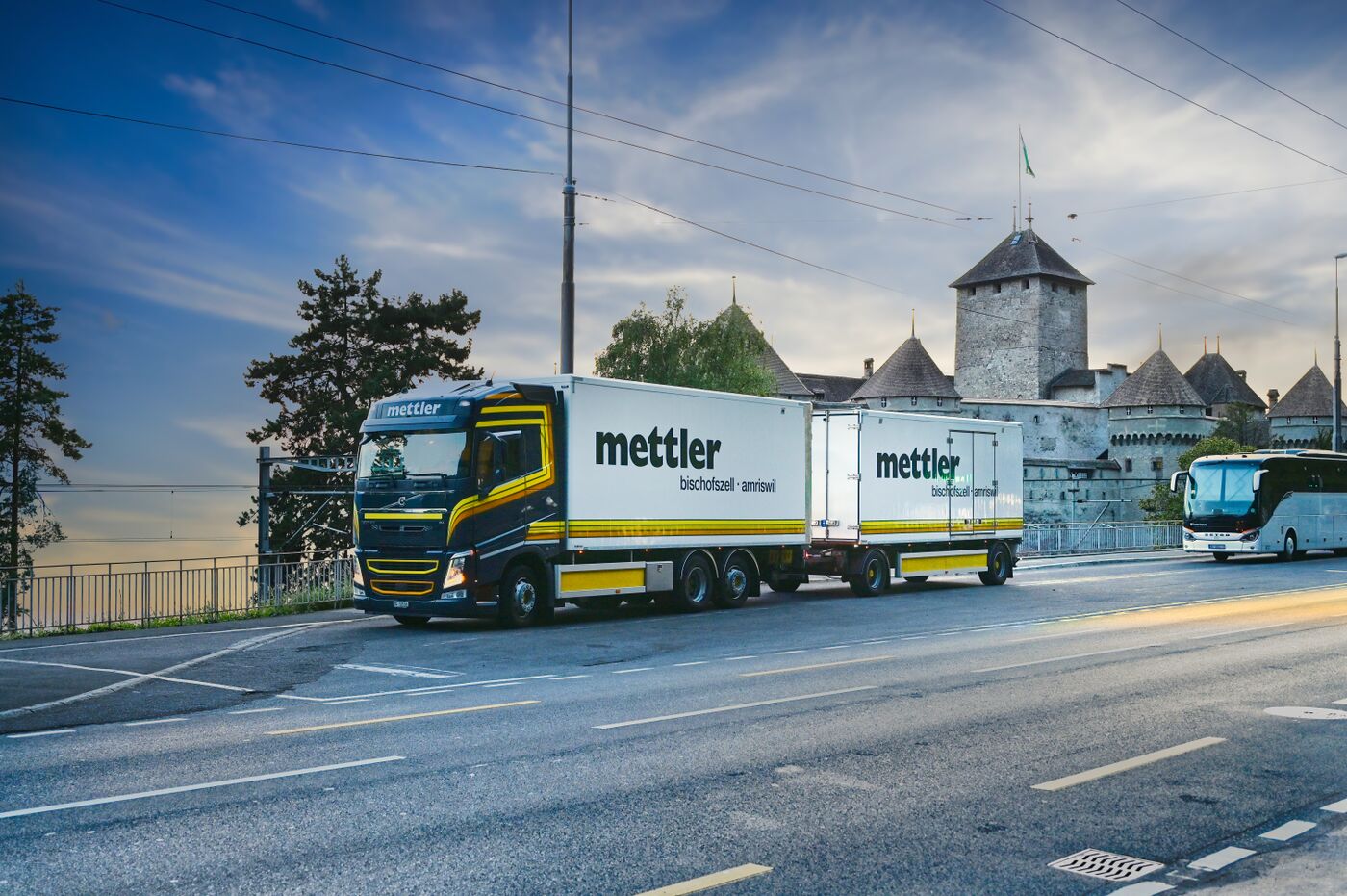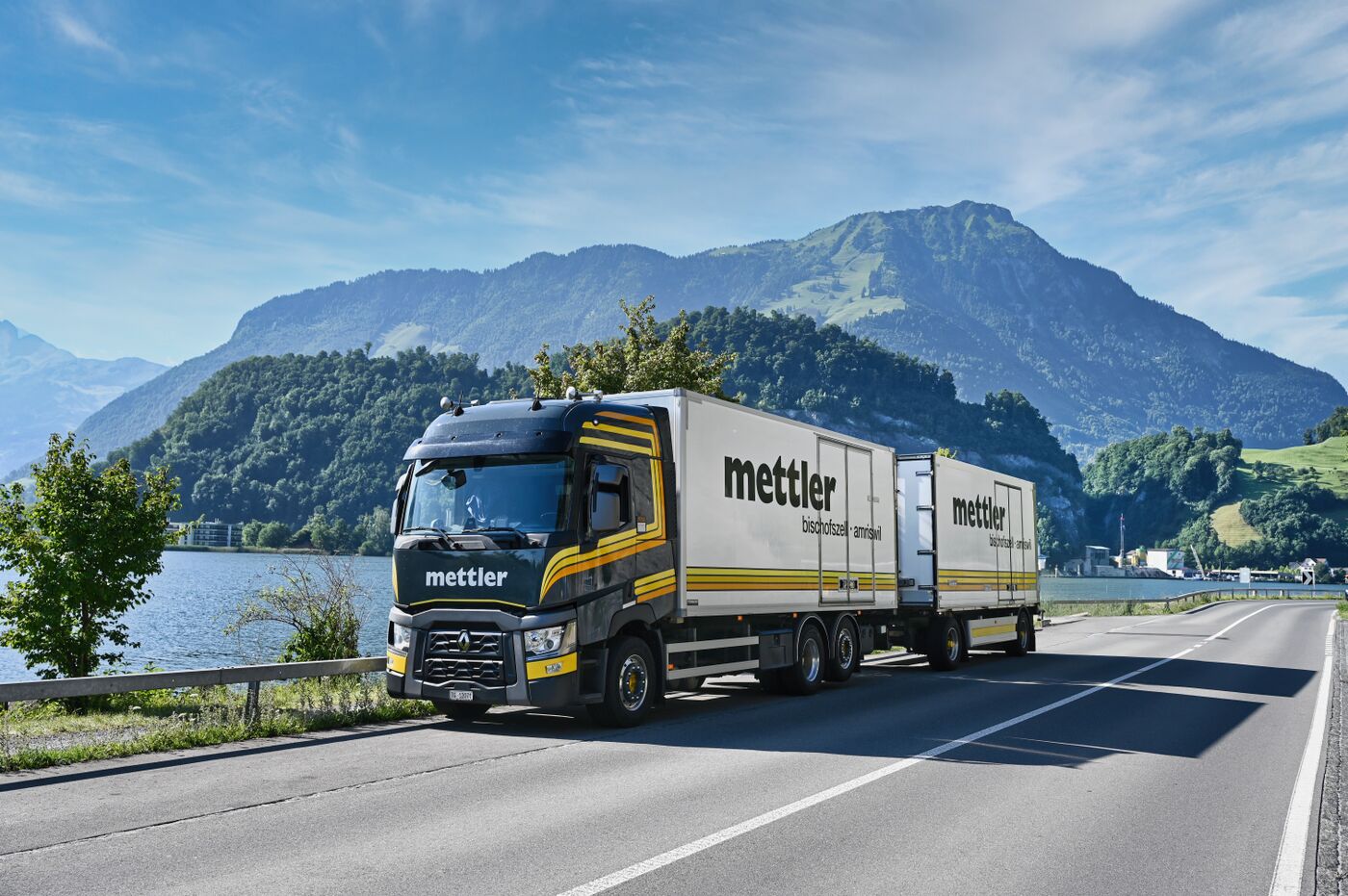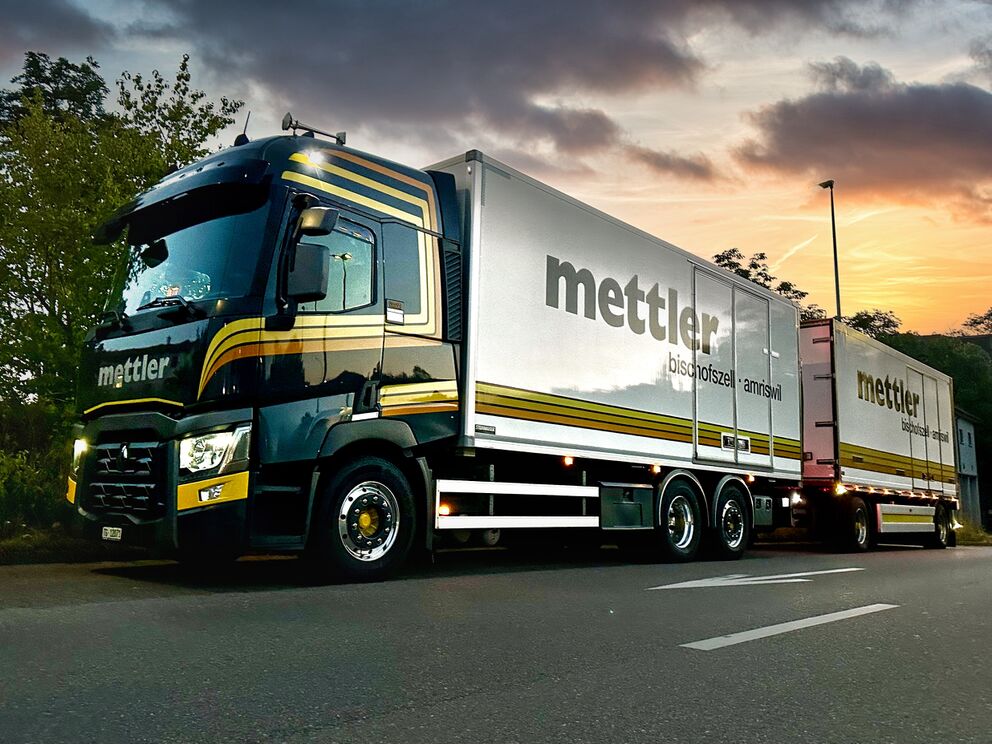 Mit unseren Anhängerzügen, bestehend aus Planen und Kühlkofferaufbauten, transportieren wir täglich
